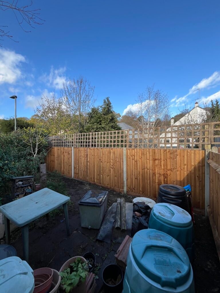 We carefully dismantled the old fence panel by panel — made more challenging by neighbouring dogs — and replaced it with new fencing designed to blend seamlessly with the existing structure. Using gravel boards, arris rails and featheredge panels, we matched the original height and style. For added privacy, a 2ft trellis was installed along the rear boundary, enhancing both screening and visual appeal.